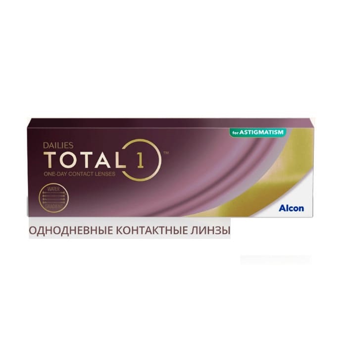 Торические линзы DAILIES TOTAL1 FOR ASTIGMATISM (30 шт.) Однодневные контактные линзы DAILIES TOTAL1 ДЛЯ АСТИГМАТИЗМА дарят комфорт в течение самого долгого дня благодаря почти 100% влаги на поверхности линзы. Уникальные технологии этих линз увлажняют и защищают ваши глаза, чтобы фокусироваться на самом важном, не отвлекаясь на дискомфорт. Технические характеристики - Срок ношения: 1 день